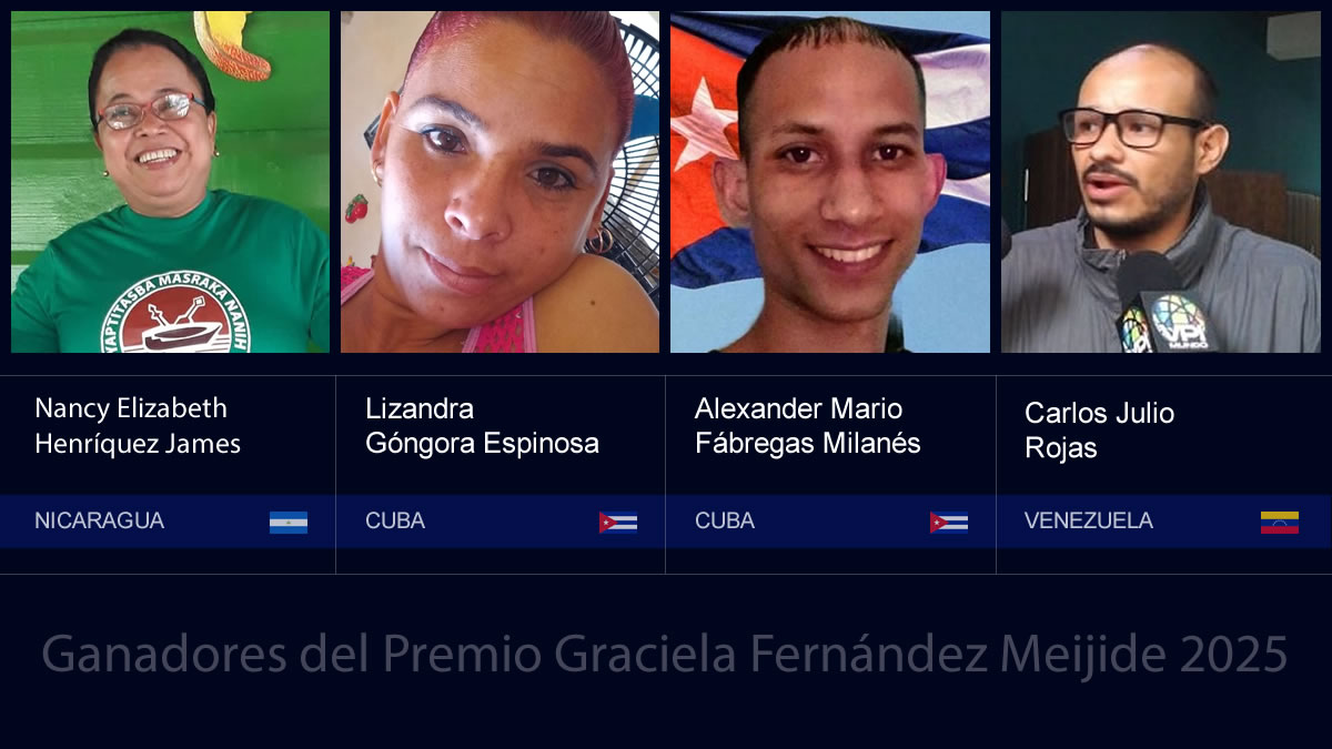 Nancy Elizabeth Henríquez James - Lizandra Góngora Espinosa - Alexander Mario Fábregas Milanés - Carlos Julio RojasEl jurado del premio “Graciela Fernández Meijide a la Defensa de los Derechos Humanos”, integrado por Rubén Chababo, Norma Morandini, Vicente Palermo, Inés Pousadela y Eduardo Ulibarri, se reunió de manera virtual, contando con la presencia de Graciela Fernández Meijide, luego de evaluar las postulaciones recibidas provenientes de Nicaragua, Cuba y Venezuela. En el acta de la reunión, el jurado expresó, en un primer momento, y de manera unánime, su alta consideración y reconocimiento a la trayectoria y valentía de todos y cada uno de los nominados, señalando la injusta situación de presidio por la que atraviesan por el solo hecho de defender de manera pacífica los ideales y principios que reglan la vida en democracia.